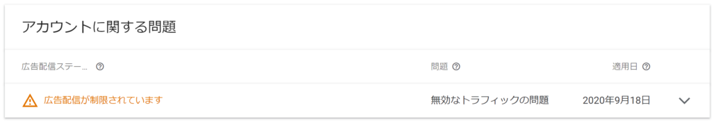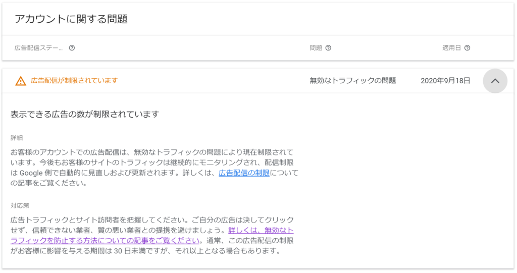 「広告配信の制限」と「詳しくは、無効なトラフィックを防止する方法についての記事をご覧ください」の二つのリンクが。