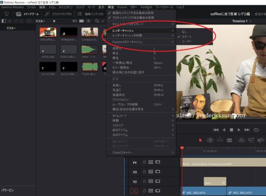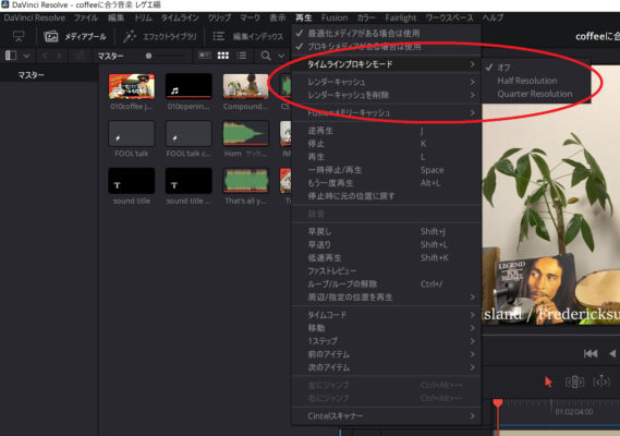 同じく「再生」⇒「タイムラインプロキシモード」⇒「Half Resolution」もしくは「Quarter Resolution」のいずれかを選択してください。